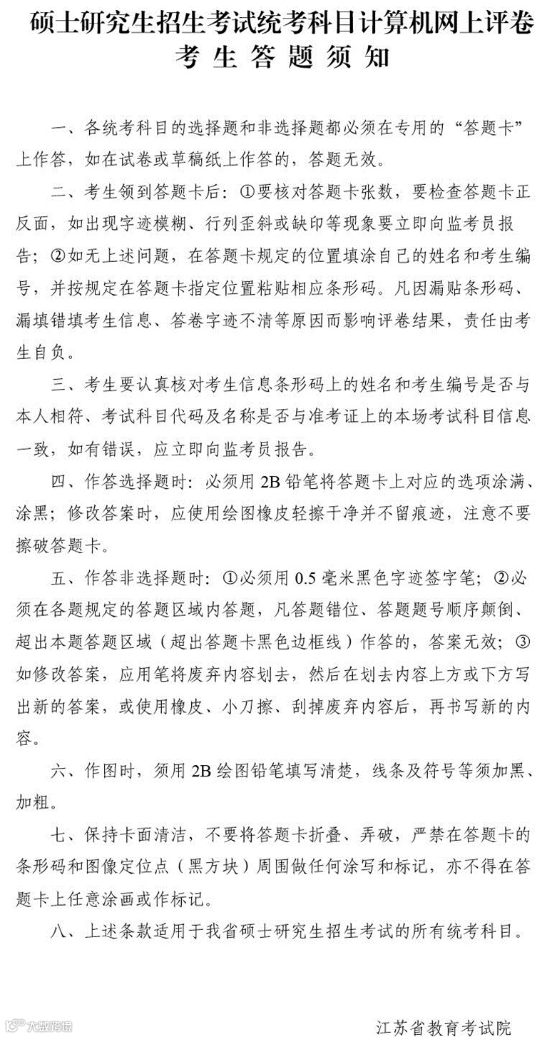 考生应提前了解江苏省教育考试院发布的《硕士研究生招生考试统考科目计算机网上评卷考生答题须知》,按要求进行统考科目答题卡的填写。