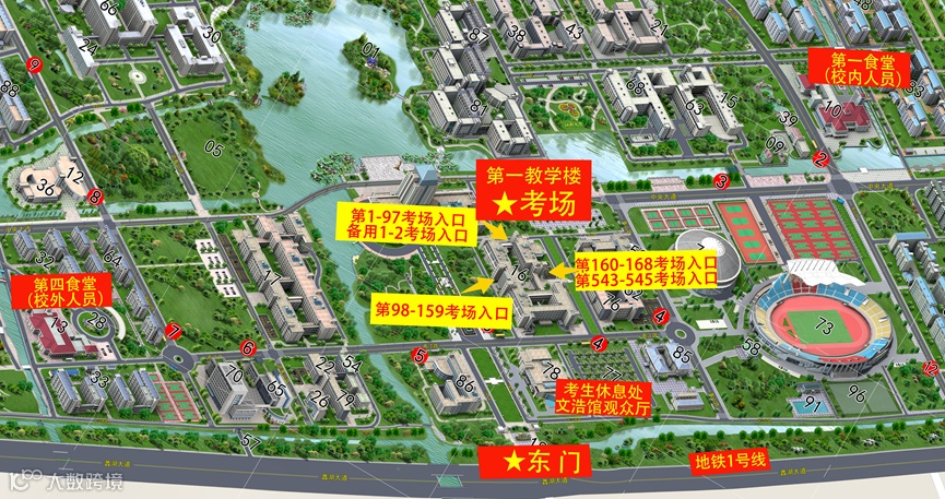 第一教学楼南、西、北侧设置了入场通道,第1-97、备用1-2考场考生只能从西侧C区入口进入考场,第98-159考场考生只能从南侧A区入口进入考场,第160-168、543、544考场考生只能从北侧C区入口进入考场,考点通知临时调整考场的考生按要求从专用入口进入考场。
