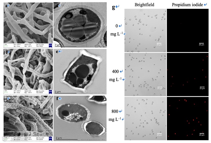 图2 白地霉菌丝体的扫描电镜和透射电镜图(a—f)与白地霉质膜完整性(g)