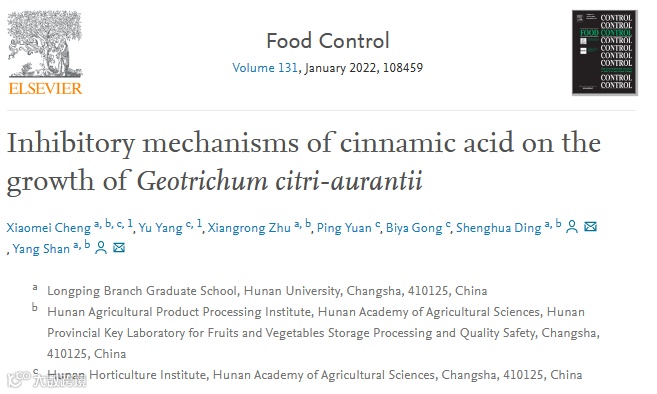 2022年1月,湖南省农业科学院/湖南大学研究生院隆平分院单杨院士课题组在国际期刊Food Control(Q1,IF: 6.652)(点击查询最新即时IF和分区) 发表题为“Inhibitory mechanisms of cinnamic acid on the growth of Geotrichum citri-aurantii ”的研究性论文。获十三五国家重点研发计划(2017YFD0401303)和湖南省长株潭国家自主创新示范区专项(2018XK 2006)资助(点击查看该刊投稿指南)。