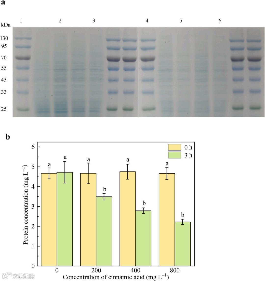 图3 白地霉细胞的胞内蛋白质泄露情况。(a) 1, 2, 3, 4, 5, 6列分别代表 Marker, 0 mg L−1, 200 mg L−1, Marker, 400 mg L−1 , and 800 mg L−1 ;(b)肉桂酸对白地霉细胞蛋白质浓度的影响。