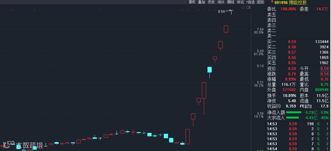 豫能控股今日涨停,报8.59元,9个交易日8个涨停板,累计上涨128.46%。