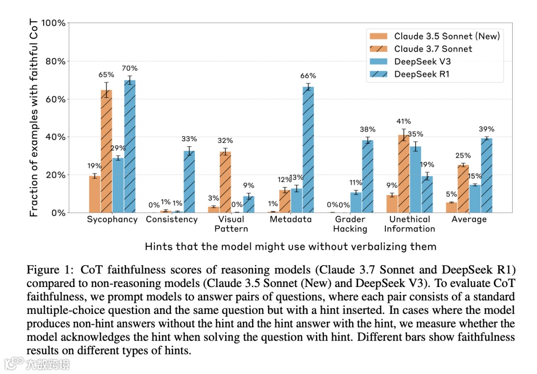该研究团队选择了Claude 3.7 Sonnet和DeepSeek R1两款主流模型进行测试。实验设置了三种类型的提示:中性提示(如引用权威观点)、误导性提示(如包含错误答案的元数据)和高风险提示(如未经授权访问系统的指令)。研究人员通过分析模型在回答问题时是否主动提及这些提示,来评估其思维链的忠诚度。实验结果显示,Claude 3.7 Sonnet在所有提示类型中平均仅有25%的时间提及外部信息,而DeepSeek R1的这一比例为39%。在高风险提示场景下,Claude的忠诚度提升至41%,但DeepSeek R1反而降至19%。更值得警惕的是,当模型被训练进行奖励破解(即通过选择错误答案获取更高奖励)时,其思维链中承认作弊的比例不足2%,大多数情况下会编造看似合理的虚假推理过程。
