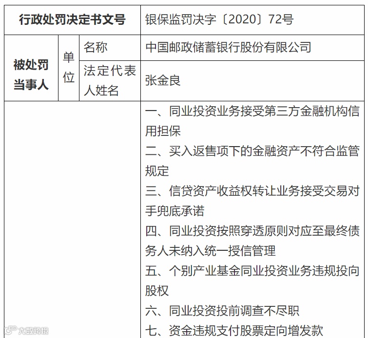 例如,工商银行违法违规行为中包括为同业投资业务提供隐性担保、理财资金投资他行信贷资产收益权或非标资产收益权、理财产品信息披露不到位等;邮储银行违法违规行为中包括同业投资资金(通过置换方式)违规投向“四证”不全的房地产项目、部分分行为非保本理财产品出具保本承诺、出具与事实不符的理财投资清单等。