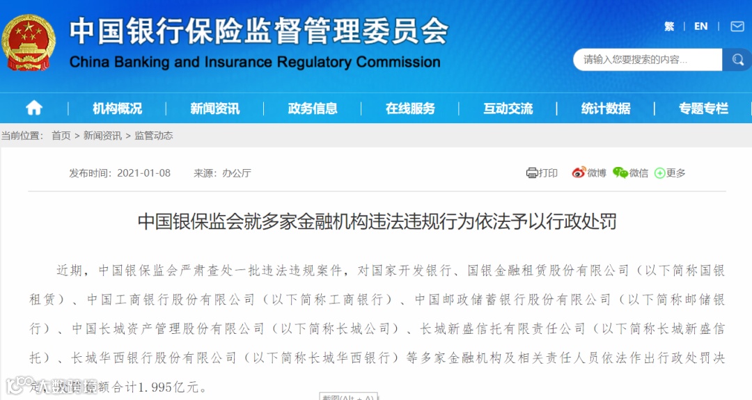 包括国家开发银行、国银租赁、工商银行、邮储银行、长城公司、长城新盛信托、长城华西银行在内的多家金融机构及相关责任人,合计被处罚1.995亿元。