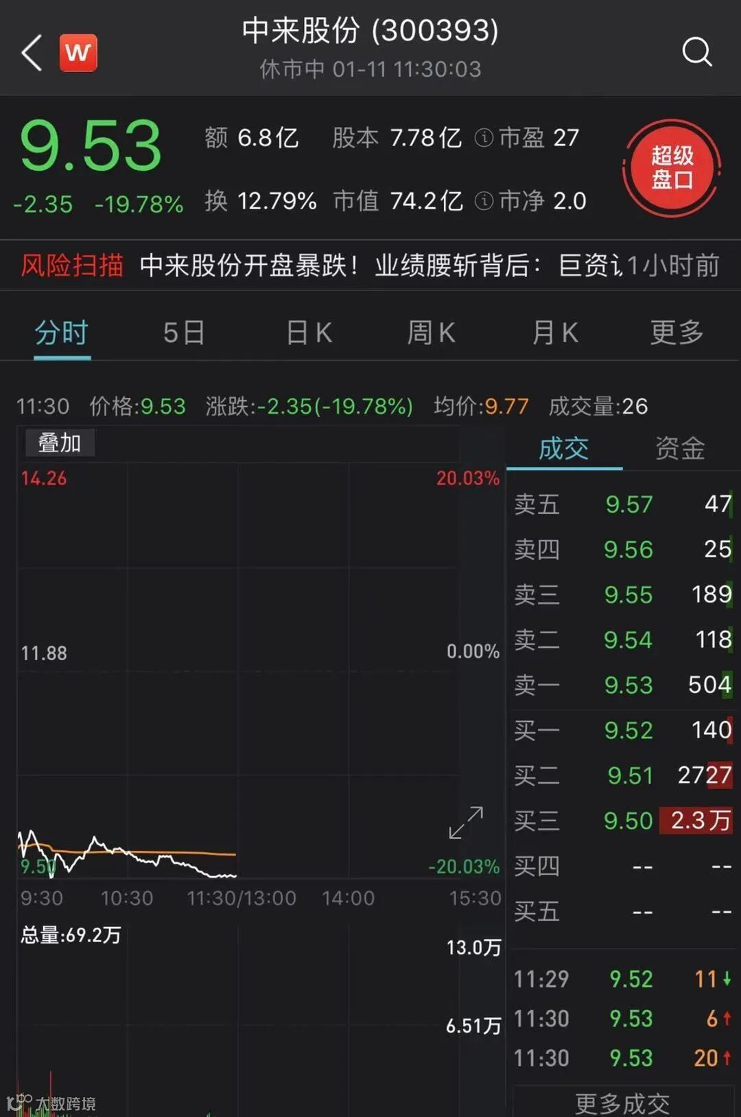 在今日大跌的个股中,中来股份开盘下跌17.51%。截至午间收盘,中来股份下跌19.78%,成交额为6.8亿元。