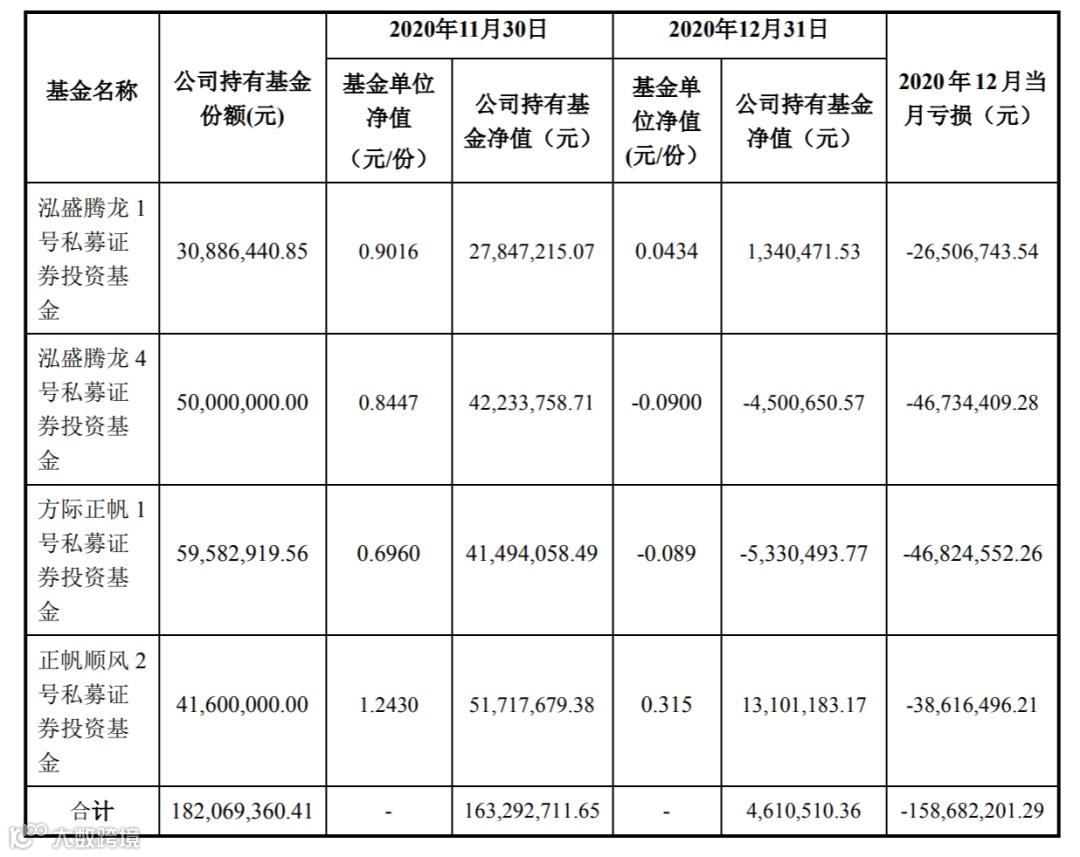 公告称,2021年1月4日午后,公司发现2020年12月31日四个基金净值较2020年11月30日均有急剧下降。根据净值表,腾龙4号、正帆1号基金的单位份额净值,已经跌成了负值,分别为-0.09元、-0.089元。四个基金产品合计于2020年12月当月亏损1.587亿元,较2020年11月亏损幅度为97.18%。