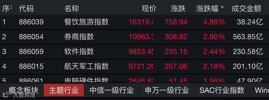Wind数据显示,截至午间收盘,上证指数上涨0.83%,报3442.79点;深证成指上涨0.98%,报14341.23点;创业板指上涨1.21%,报2935.7点。沪深两市半日成交额超5900亿元。