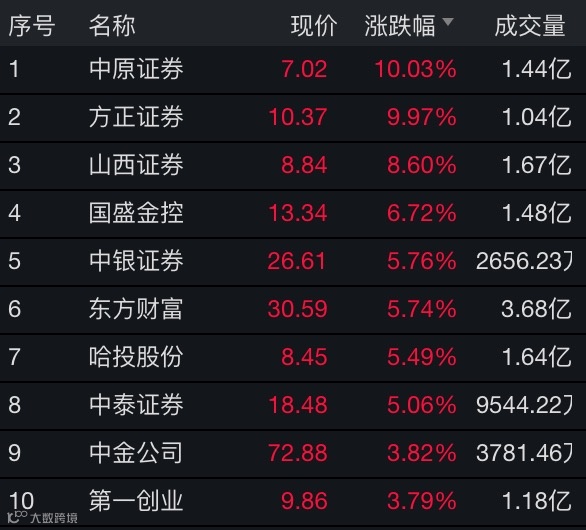 Wind数据显示,截至午间收盘,券商板块涨幅为2.90%,涨幅仅次于餐饮旅游板块。板块内,中原证券、方正证券涨停,国盛金控、山西证券盘中触及涨停。