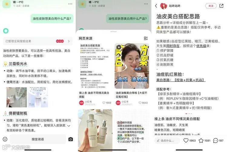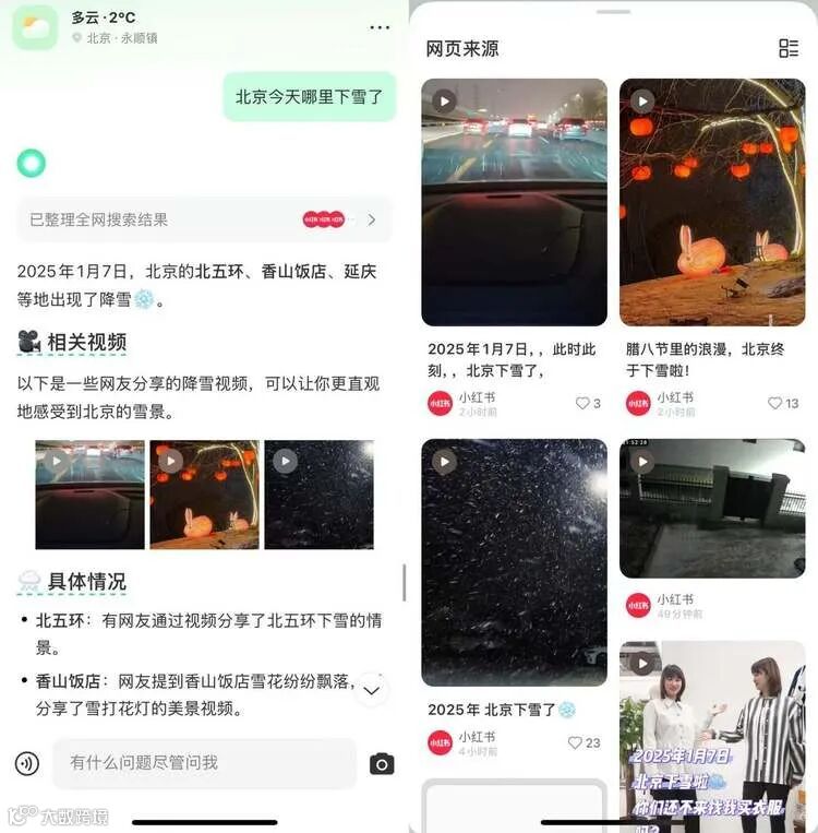 此外,以UGC内容为信源,展现出强大的信息整合能力。并非简单调用常规数据,而是实时整合小红书社区内用户的实地探访笔记、评论等非结构化数据。像回答北京哪里下雪的问题时,能抓取用户实拍视频,结合评论区提到的下雪地点等信息,给出准确又实时的回复,这是很多AI搜索产品难以企及的。而且,不仅支持多模态理解,对语音和图片输入都能准确把握,还能通过“探索功能”采用引导式交互,用户点击答案中的关键词就能延展搜索,降低了二次提问的门槛,让搜索过程更接近自然对话,极大地提升了用户的使用体验。