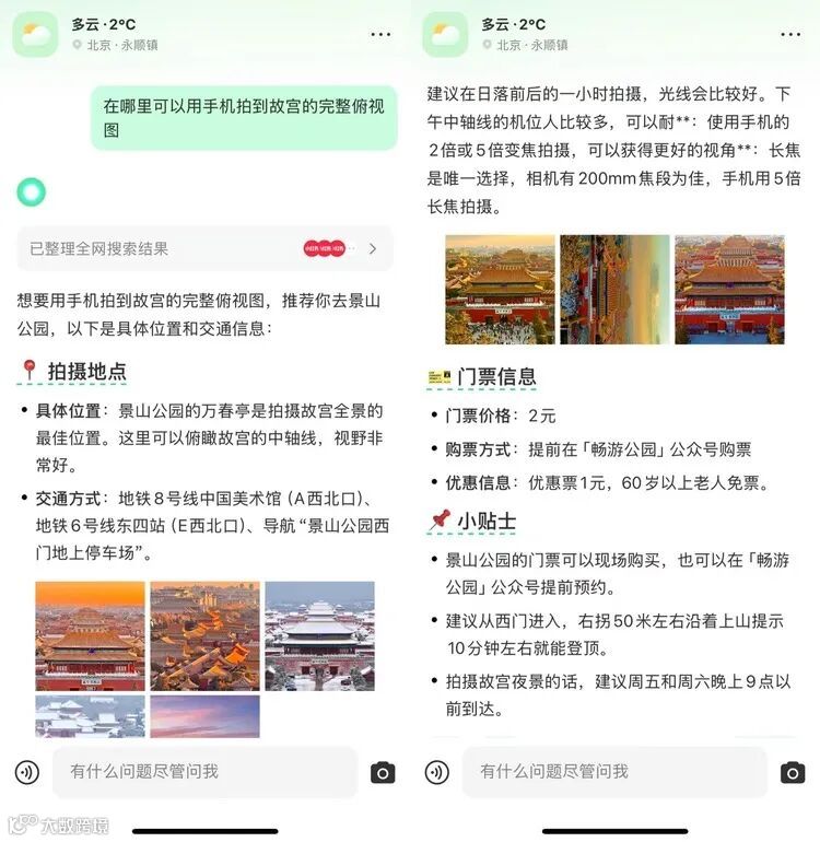 其优势十分显著,体现在定位上。它避开了小红书的商品种草基本盘,主打“出门在外问点点”,以生活搜索助手的角色切入,聚焦解决用户旅游攻略、生活常识等场景的问题。例如,当用户询问“在哪里可以用手机拍摄到故宫的完整俯视图”时,能给出包含具体位置、拍摄时间、设备参数、交通方式等非常完整的攻略,实用性很强,这体现出在生活场景应用方面的出色表现,能为用户提供真实且全面的信息,满足大家日常出行、生活中的各种需求。