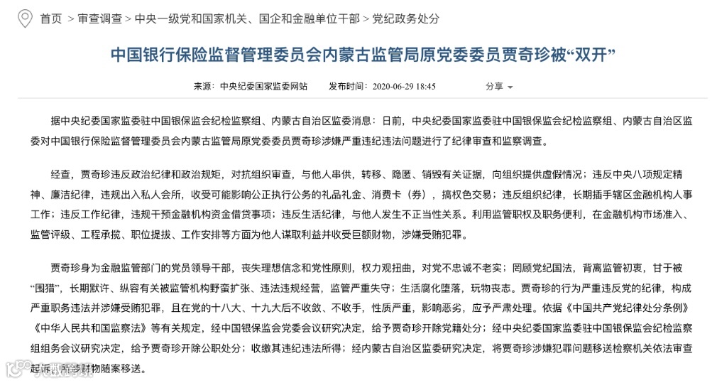 例如,中国银行保险监督管理委员会内蒙古监管局原党委委员贾奇珍,经查,贾奇珍违反政治纪律和政治规矩,对抗组织审查,与他人串供,转移、隐匿、销毁有关证据,向组织提供虚假情况;违反中央八项规定精神、廉洁纪律,违规出入私人会所,收受可能影响公正执行公务的礼品礼金、消费卡(券),搞权色交易;违反生活纪律,与他人发生不正当性关系等。