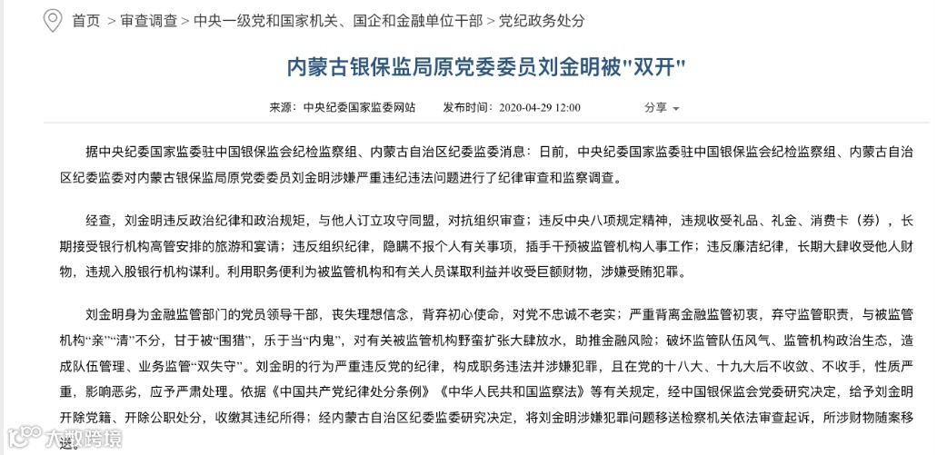 例如,内蒙古银保监局原党委委员刘金明,经查,刘金明违反政治纪律和政治规矩,与他人订立攻守同盟,对抗组织审查;违反中央八项规定精神,违规收受礼品、礼金、消费卡(券),长期接受银行机构高管安排的旅游和宴请;违反组织纪律,隐瞒不报个人有关事项,插手干预被监管机构人事工作;违反廉洁纪律,长期大肆收受他人财物,违规入股银行机构谋利。利用职务便利为被监管机构和有关人员谋取利益并收受巨额财物,涉嫌受贿犯罪。刘金明身为金融监管部门的党员领导干部,丧失理想信念,背弃初心使命,对党不忠诚不老实;严重背离金融监管初衷,弃守监管职责,与被监管机构“亲”“清”不分,甘于被“围猎”,乐于当“内鬼”,对有关被监管机构野蛮扩张大肆放水,助推金融风险;破坏监管队伍风气、监管机构政治生态,造成队伍管理、业务监管“双失守”。