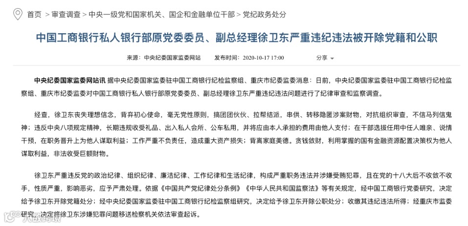 例如,中国工商银行私人银行部原党委委员、副总经理徐卫东,经查,徐卫东丧失理想信念,背弃初心使命,毫无党性原则,搞团团伙伙、拉帮结派,串供、转移隐匿涉案财物,对抗组织审查,不信马列信鬼神;违反中央八项规定精神,长期违规收受礼品、出入私人会所、公车私用,并将应由本人承担的费用由他人支付;在干部选拔任用中任人唯亲、说情干预,在职务晋升上为他人谋取利益;工作严重不负责任,造成重大资产损失;背离家庭美德。贪钱敛财,利用掌握的国有金融资源配置决策权为他人谋取利益,非法收受巨额财物。
