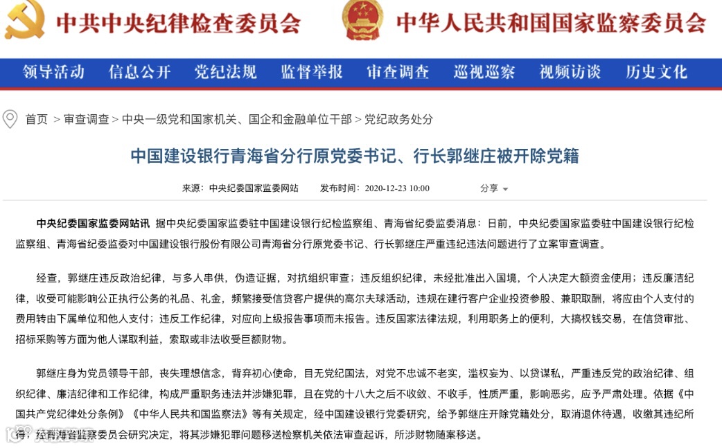 例如,中国建设银行青海省分行原党委书记、行长郭继庄,经查,郭继庄违反政治纪律,与多人串供,伪造证据,对抗组织审查;违反组织纪律,未经批准出入国境,个人决定大额资金使用;违反廉洁纪律,收受可能影响公正执行公务的礼品、礼金,频繁接受信贷客户提供的高尔夫球活动,违规在建行客户企业投资参股、兼职取酬,将应由个人支付的费用转由下属单位和他人支付等。