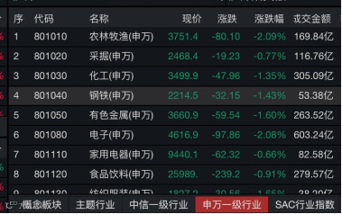据Wind数据,截至午间收盘,采掘、钢铁、有色金属板块分别跌0.77%、1.43%、1.60%。