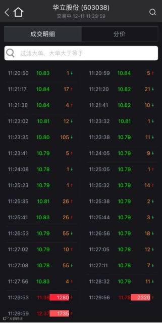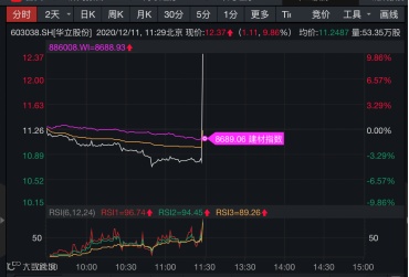 与确成股份开盘天地板相对应的是,华立股份临近午间收盘暴力拉升,从下跌逾4%到逼近涨停,不足90秒。