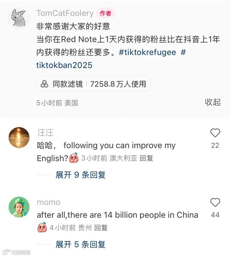 1月12日清晨,众多中国网友打开小红书,被眼前景象惊到,仿佛置身异国他乡。“TikTok Rufugee”话题占据屏幕,主页上尽是外国友人的头像。这些自称“嘀嗒难民”的外国用户,因TikTok可能被禁,在短短一天内,让#TikTok Refugee话题收获21万讨论和660多万浏览量,即便存在近十小时的时差也未能阻挡这一热度飙升。