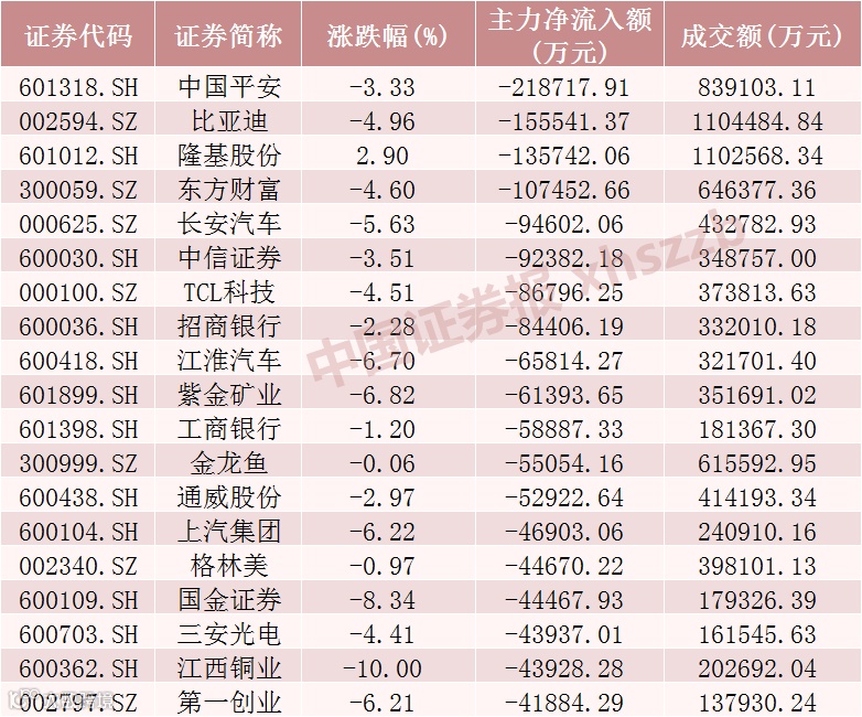 从个股情况来看,Wind数据显示,今日中国平安、比亚迪、隆基股份、东方财富主力资金净流出金额居前,分别净流出21.87亿元、15.55亿元、13.57亿元、10.75亿元。此外长安汽车、中信证券、TCL科技、招商银行、江淮汽车、紫金矿业、工商银行、金龙鱼、通威股份等9只个股主力资金净流出超5亿元。可以看到,流动性好的热门股遭遇主力资金流出。