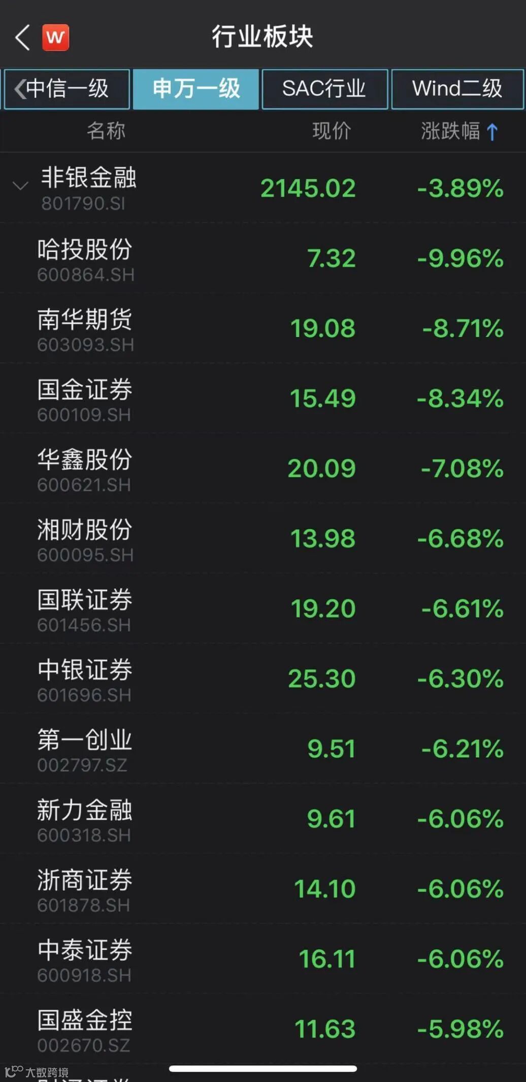 非银金融行业中,哈投股份跌停,南华期货、国金证券跌逾8%,华鑫股份跌逾7%,湘财股份、国联证券、中银证券等跌逾6%,券商股下跌明显。