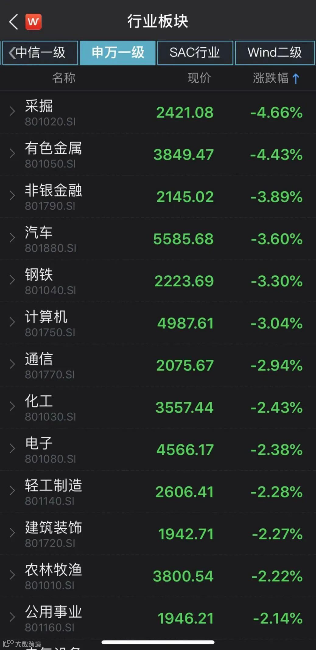 12月22日,从申万一级行业情况来看,仅有休闲服务、食品饮料行业上涨,涨幅分别为1.37%、0.89%,其他行业板块均下跌,采掘、有色金属、非银金融行业跌幅居前,分别下跌4.66%、4.43%、3.89%。
