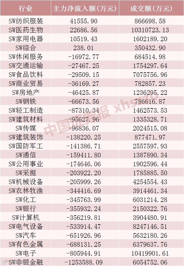 从行业板块情况来看,今日仅有纺织服装、医药生物、家用电器、综合行业出现主力资金净流入,分别净流入4.16亿元、2.27亿元、1.05亿元、0.02亿元;非银金融、电子、有色金属行业主力资金净流出金额居前,分别净流出125.36亿元、80.59亿元、68.81亿元。