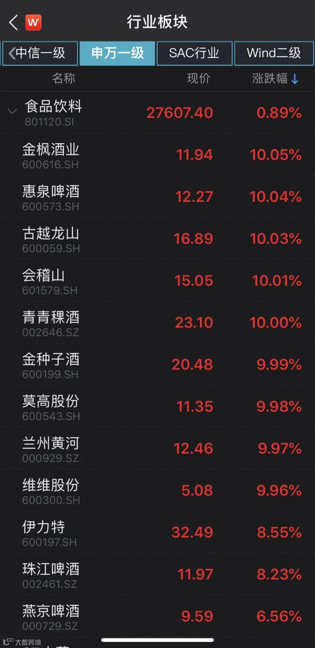 一边是酒类板块持续大涨,一边则是周期类板块和券商股明显调整。