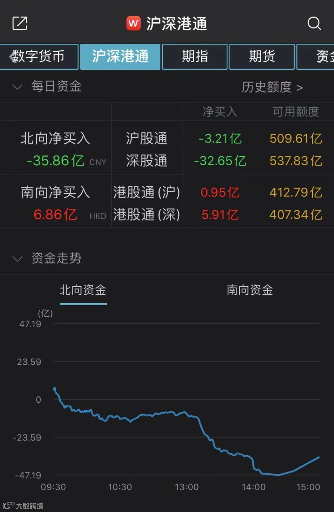 Wind数据显示,今日北向资金净流出35.86亿元,其中沪股通资金净流出3.21亿元、深股通资金净流出32.65亿元。值得注意的是,午后北向资金加速流出,而大盘也是在午后跳水。这部分资金与场内资金共振,形成恐慌性出逃。