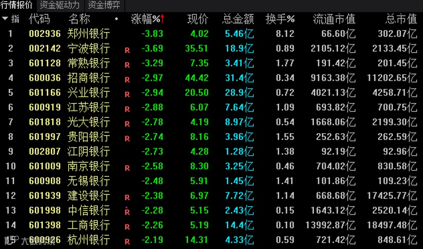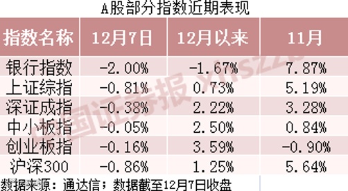 近期与周期股板块共同扛起领涨大旗的银行板块,在经过上周后半周的震荡走弱后,今天(12月7日)再显颓势,板块个股几乎全线下挫,银行指数单日跌幅位列两市第二。