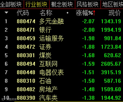 从板块指数来看,通达信数据显示,截至收盘,多元金融、银行、证券板块分别下跌2.07%、2.00%和1.88%,在两市56个行业板块指数中,位列跌幅榜的第一、第二和第四位。整体来看,前期领涨的大金融板块,在今天领跌两市,并在很大程度上拖累了大盘的表现。
