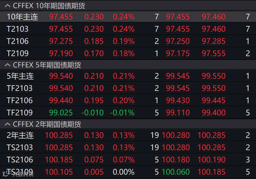 截至午盘,国债期货全面上涨,其中10年期期债主力合约上涨0.24%。