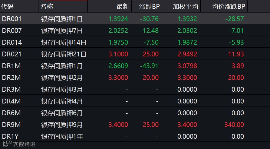 截至15日11时,银行间市场隔夜、7天、14天期限的回购利率纷纷大幅下行,其中隔夜回购利率大跌逾30BP至1.39%。