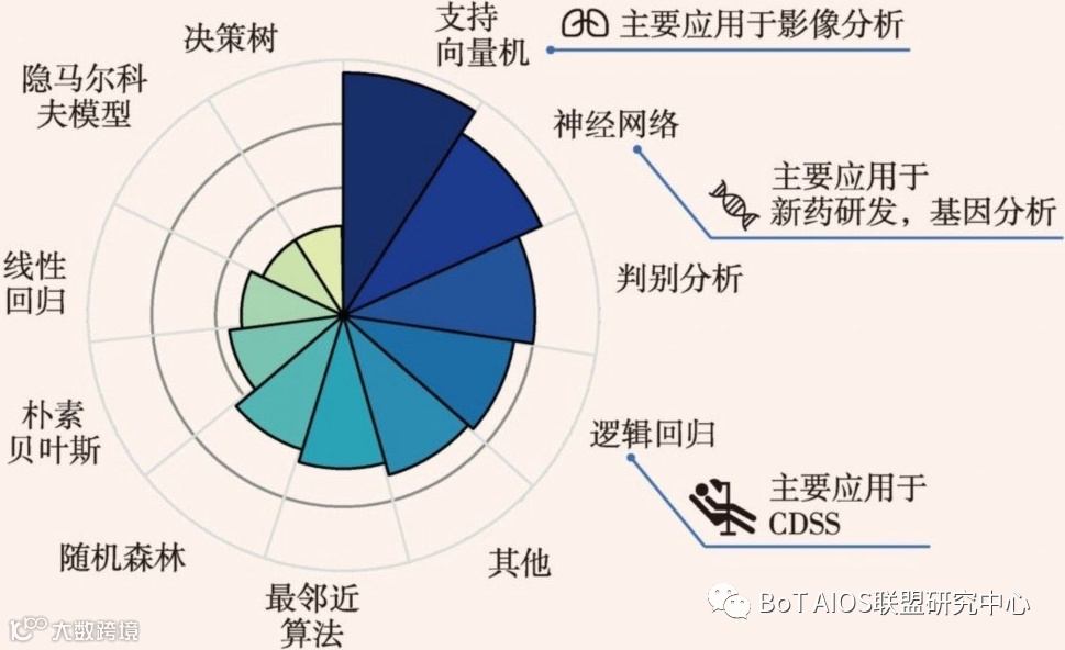 ①支持向量机(38%),主要应用于识别成像生物标志物和医疗影像分析; ②神经网络(34%),主要应用于生化分析、图像分析和药物开发; ③逻辑回归(4%),主要用于疾病风险评估和临床决策辅助系 |