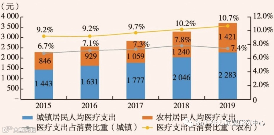 就居民消费结构而言,医疗消费占城镇居民消费总支出6%—8%,占农村居民消费总支出9%—11%,这一定程度上反映了医疗资源在农村地区的较大需求以及医疗效率提升的迫切性。