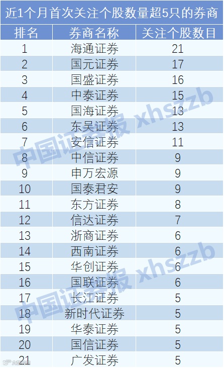从券商角度看,海通证券近1月首次关注的个股最多,关注了21只;国元证券排名第二,近1月首次关注了17只个股;国盛证券近1月首次关注了16只个股,排名第三;中泰证券近1月首次关注了15只个股,排名第四;国海证券、东吴证券近1月均首次关注了13只个股,并列排名第五。