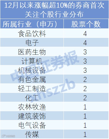 上述195只个股中,12月以来涨幅超10%的总计有27只。其中属于食品饮料和电子行业的个股均有4只,数量排名并列第一;属于医药生物、计算机、机械设备行业的个股均有3只,数量排名第二。