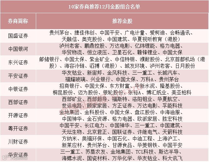 目前已有10家券商公布了12月金股名单,推荐的近百只个股覆盖了保险、银行、机械、建筑、化工、白酒、采掘、有色金属、家电等数十个细分领域。