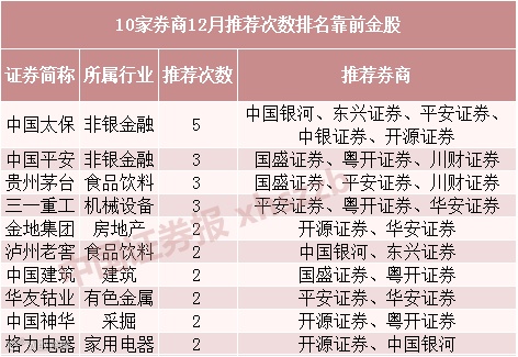 截至中证君11月30日发稿,已有10家券商披露了12月月度投资组合,中国太保成为券商最看好的金股,此外中国平安、贵州茅台、三一重工、金地集团等个股也受到多家券商联合推荐,其投资价值备受看好。