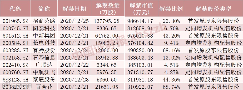 具体来看,Wind数据显示,招商公路12月25日将解禁13.78亿股,均为首发原股东限售股份。闻泰科技12月21日将解禁8336.67万股,均为定向增发机构配售股份。中新集团12月21日将解禁6.48亿股,均为首发原股东限售股份。长电科技12月21日将解禁1.51亿股,均为定向增发机构配售股份。