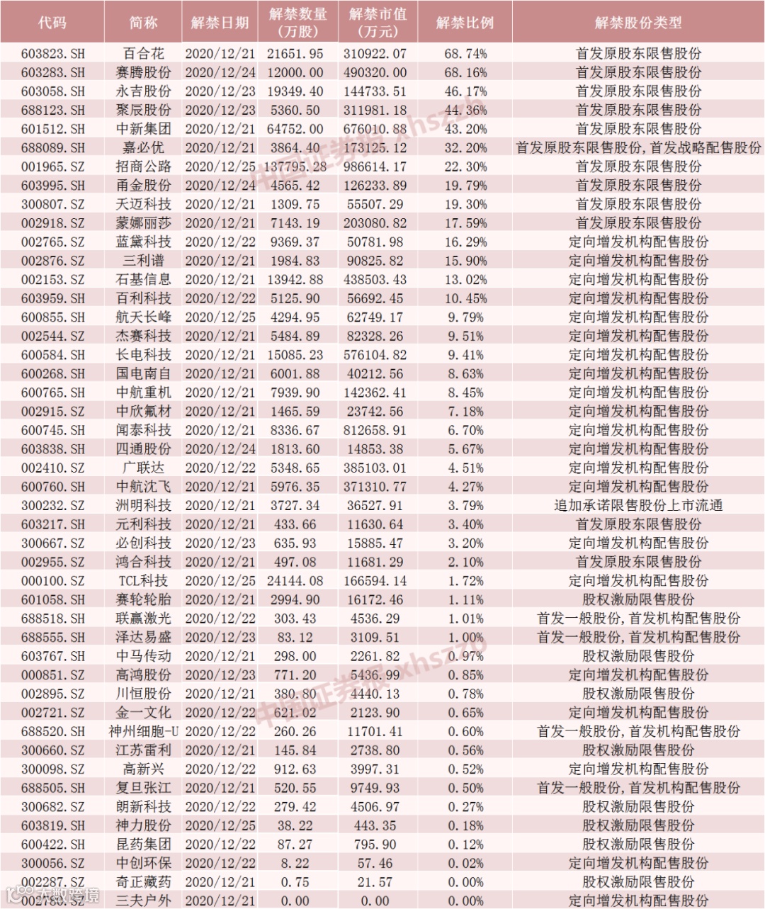 5只股票解禁比例超40%