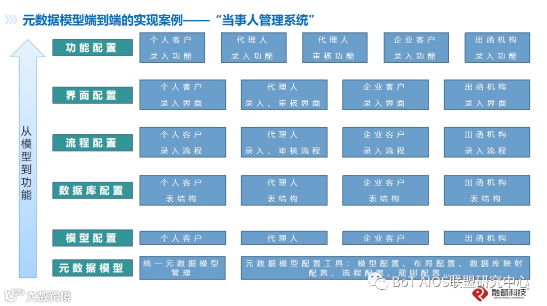 采用元数据模型驱动的端到端设计思路,实现当事人管理系统,包括:模型配置(规则)、数据库结构配置、界面配置、流程配置和功能配置。