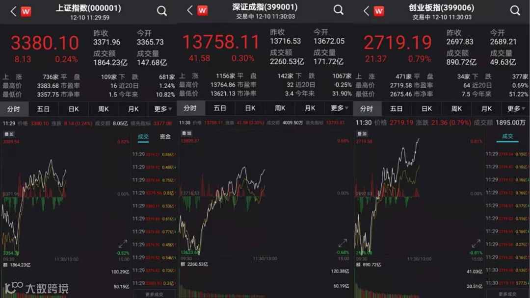 12月10日上午,A股三大指数集体低开下探后上演V型反弹。截至午间收盘,上证指数上涨0.24%,深证成指上涨0.3%,创业板指上涨0.79%。Wind数据显示,两市半日成交额超4100亿元,北向资金半日净买入26.92亿元。