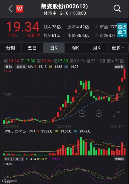 医美概念股朗姿股份作为市场近期焦点股之一,早盘走出4连板,午盘报19.34元/股,总市值为85.6亿元,半日成交额为4.73亿元,换手率为9.61%。