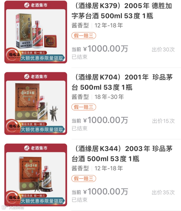 记者在阿里拍卖平台上还看到,多款千万元级别的茅台酒拍卖。2020年7月15日,“2005年德胜加字茅台酒500ml53度一瓶”的拍卖引来1015人次围观,参与竞拍的报名人数为15人,经过30轮拍卖,最终为编号为B4409的买家以1千万元的价格成交。同一天,另两瓶不同年份的茅台酒也以1000万元的落槌价成交。