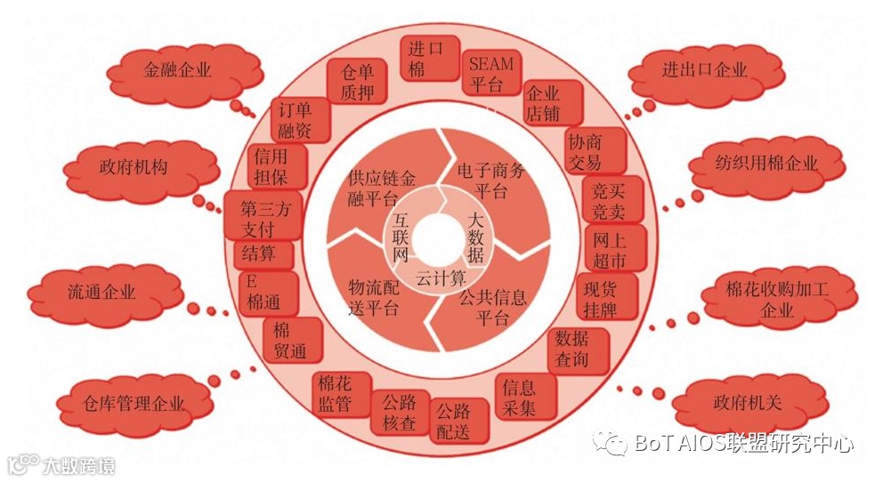 典型案例如全国棉花交易市场,以“服务棉花产业、促进规范流通”为目标,以棉花公共信息平台提供的大数据为基础,全面整合电子商务、物流配送和在线金融服务所产生的业务流、资金流和信息流,打造一体化的棉花供应链综合服务平台,与产业链各方共同构建中国棉业新型生态圈。