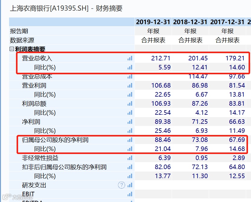 从业绩来看,2017-2019年,上海农商银行的营业收入从179.21亿元增至212.71亿元,复合年增长率为8.95%;归属于母公司股东的净利润从67.69亿元增至88.46亿元,复合年增长率为14.31%。从上海农商银行2020年三季报来看,其今年前9月实现营业收入153.59亿元,净利润60.53亿元。