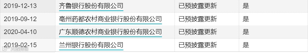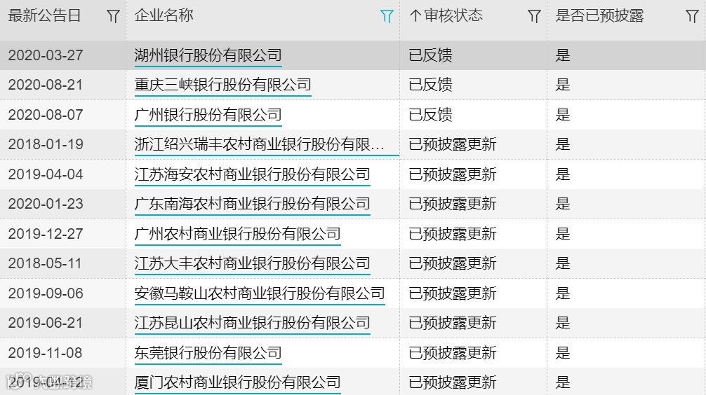 其中,兰州银行、江苏大丰农商行、马鞍山农商行、东莞银行、广州农商行、广州南海农商行、广东顺德农商行、浙江绍兴瑞丰农商行、厦门农商行、亳州药都农商行、江苏海安农商行、江苏昆山农商行、齐鲁银行13家银行的审核状态是预先披露更新,湖州银行、广州银行、重庆三峡银行三家银行的审核状态是已反馈。