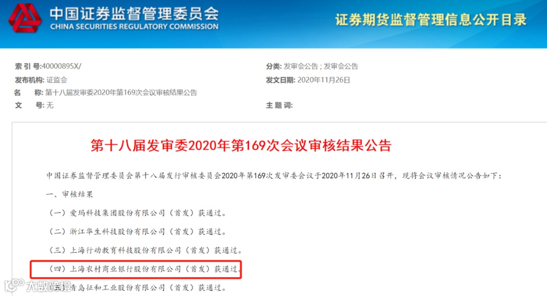 11月26日晚,证监会宣布上海农商银行等5家公司首发获通过。