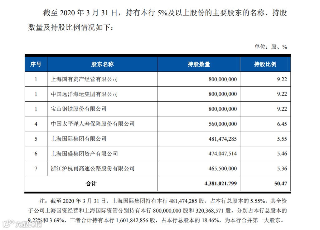 其中,上海国际集团持有上海农商银行总股本的5.55%,其全资子公司上海国资经营和上海国际资管分别持该行总股本的9.22%和 3.69%,三者合计持股比例占总股本的18.46%,为该行合并第一大股东。