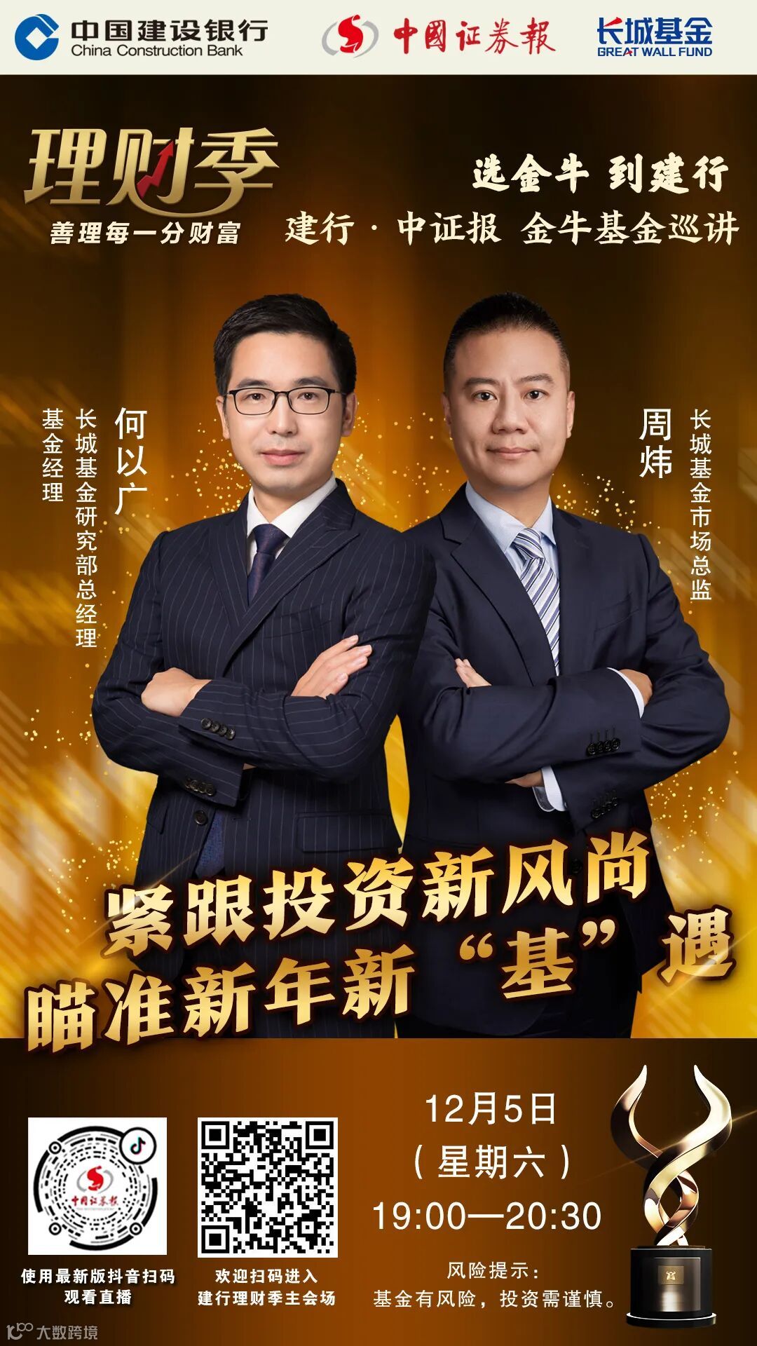 医药股调整到位了吗?“煤飞色舞”“大象起舞”将会延续多久?首发基金受热捧,如何借“基”分享股市红利?12月5日(本周六)晚7点,长城基金研究部总经理、基金经理何以广和长城基金市场总监周炜做客中证报抖音直播间,围绕“紧跟投资新风尚 瞄准新年新‘基’遇”的主题与粉丝进行交流,更有精美礼品等着你,使用最新版抖音扫下方海报中的二维码即可观看直播!